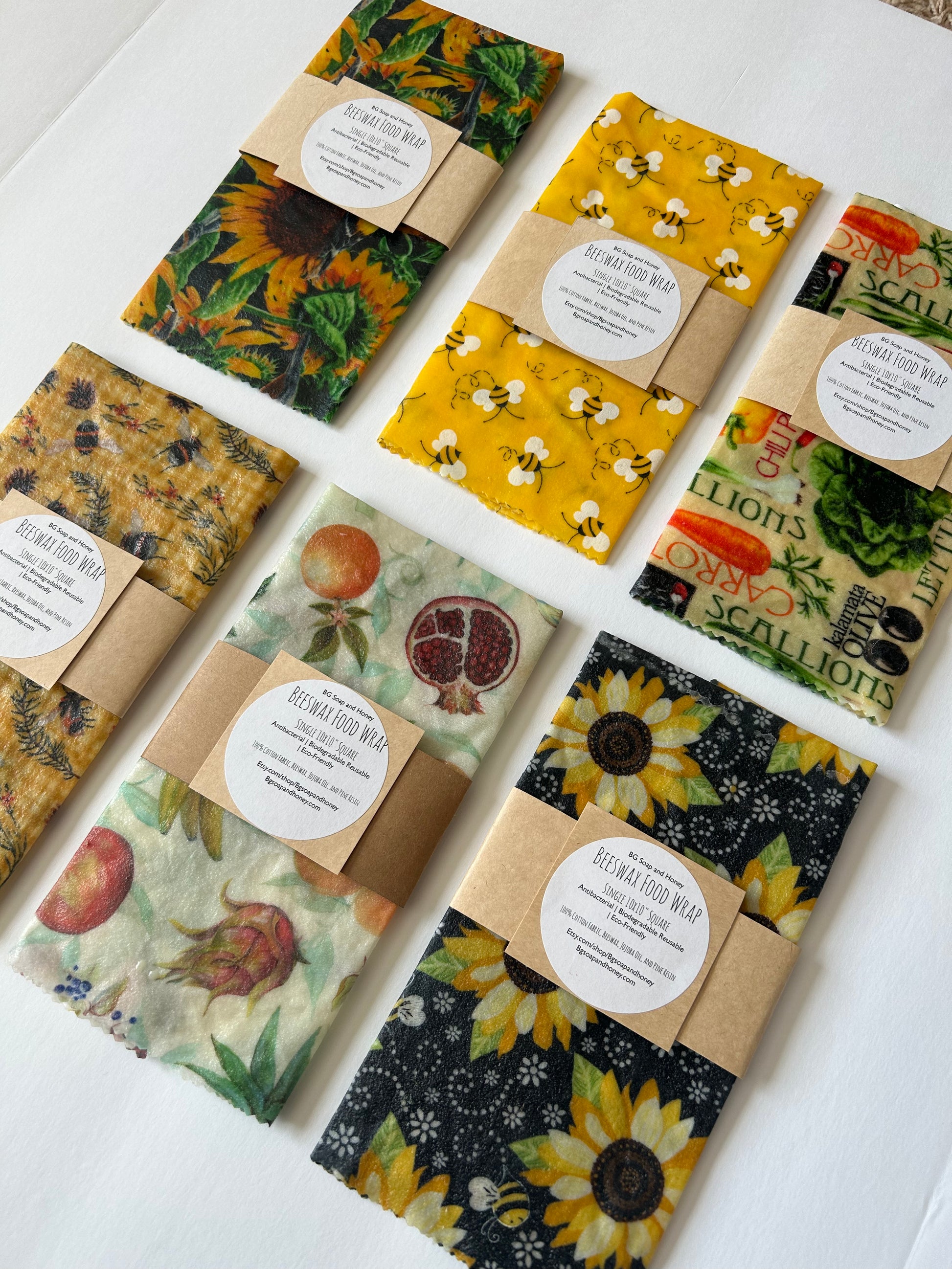 1 10” x 10” square beeswax wrap. Beeswax wraps are an eco- friendly substitution to plastic wrap and baggies! You can use them to cover dishes, keep produce from going bad, take a sandwich on the go, let cheese breathe naturally, keep bread from going stale, cover food while outside, and so much more!