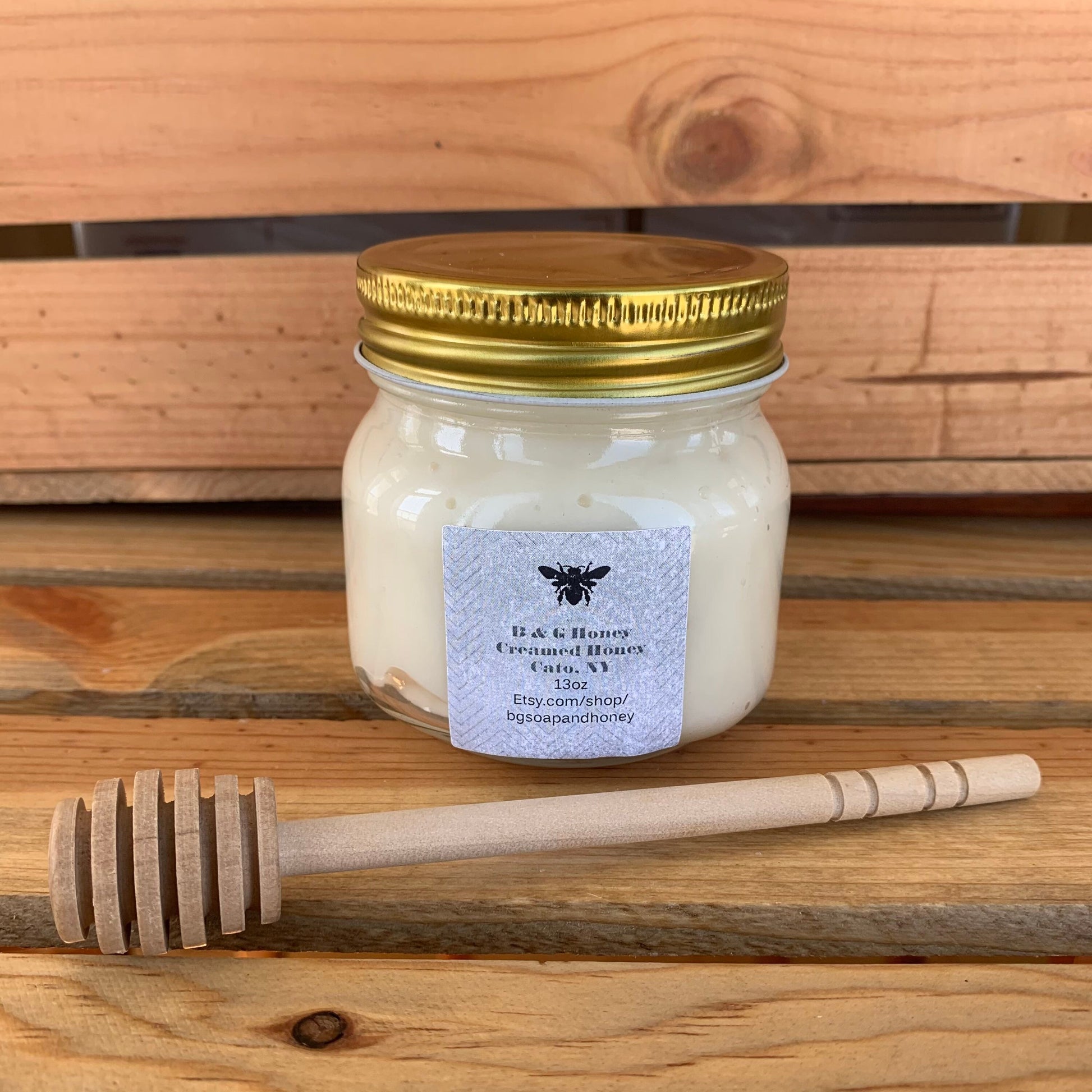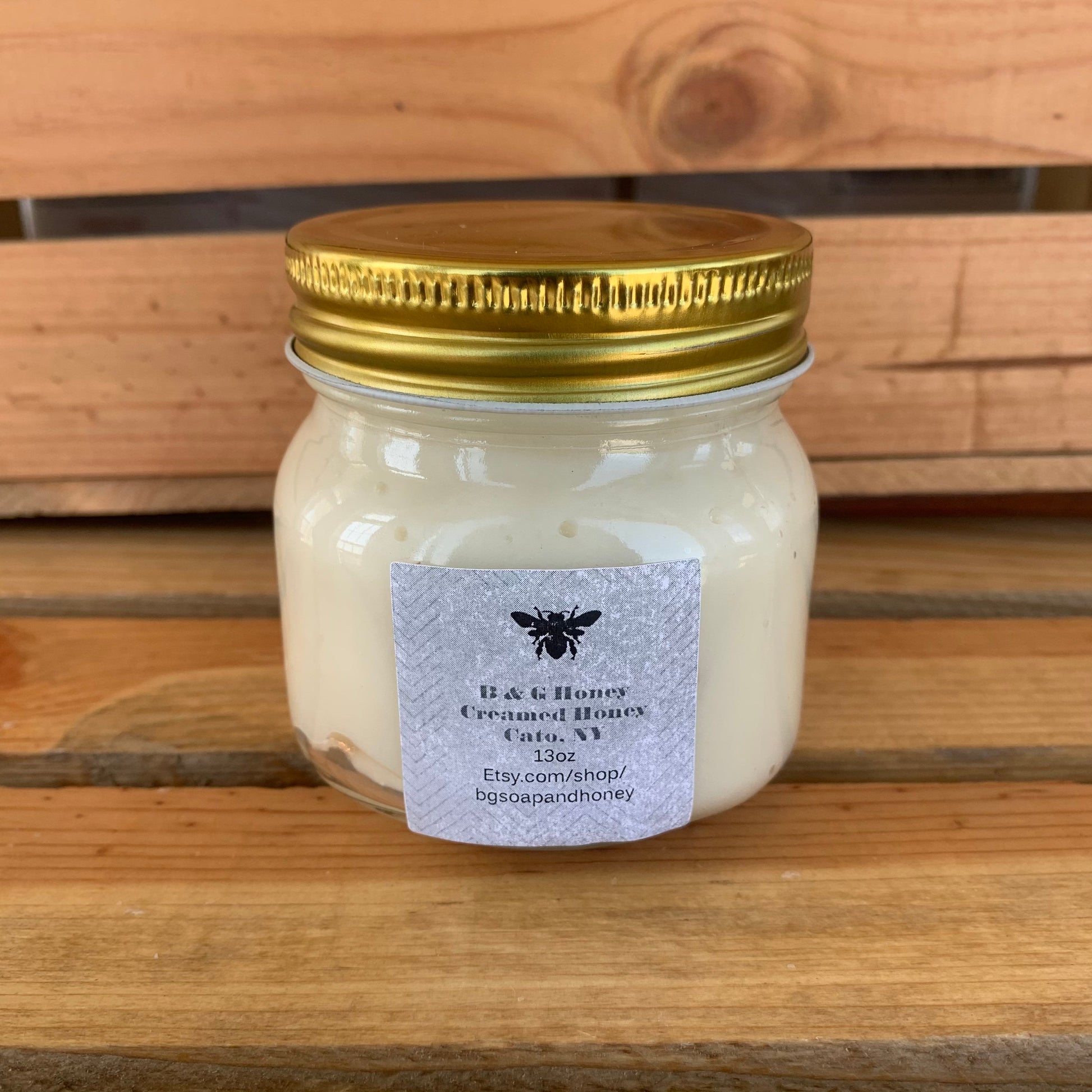 All natural creamed honey 13oz glass jar. Made with raw unfiltered wildflower honey from our very own honey bees. Smooth and creamy! Creamed honey is an all natural wholesome alternative to other spreads.