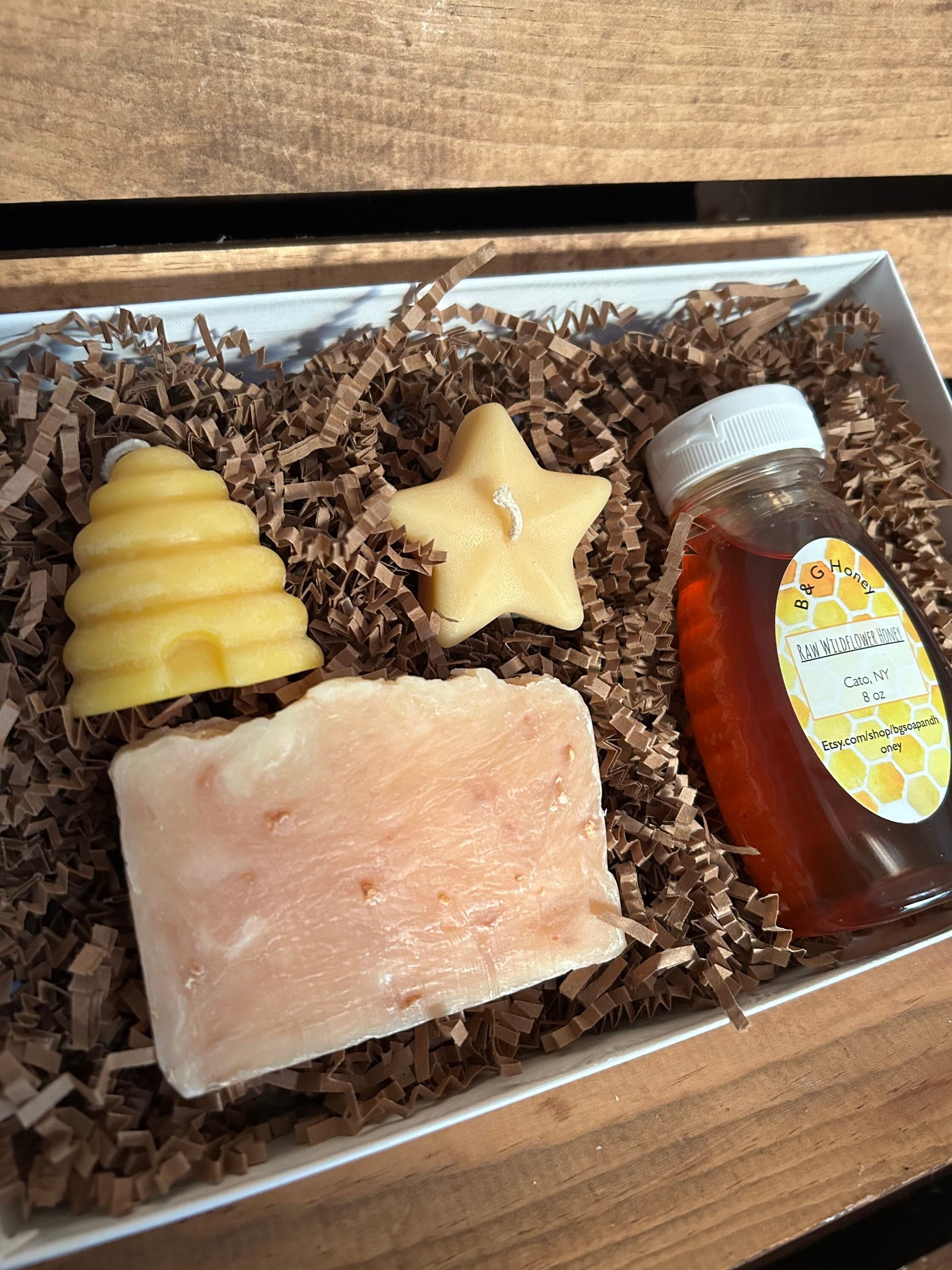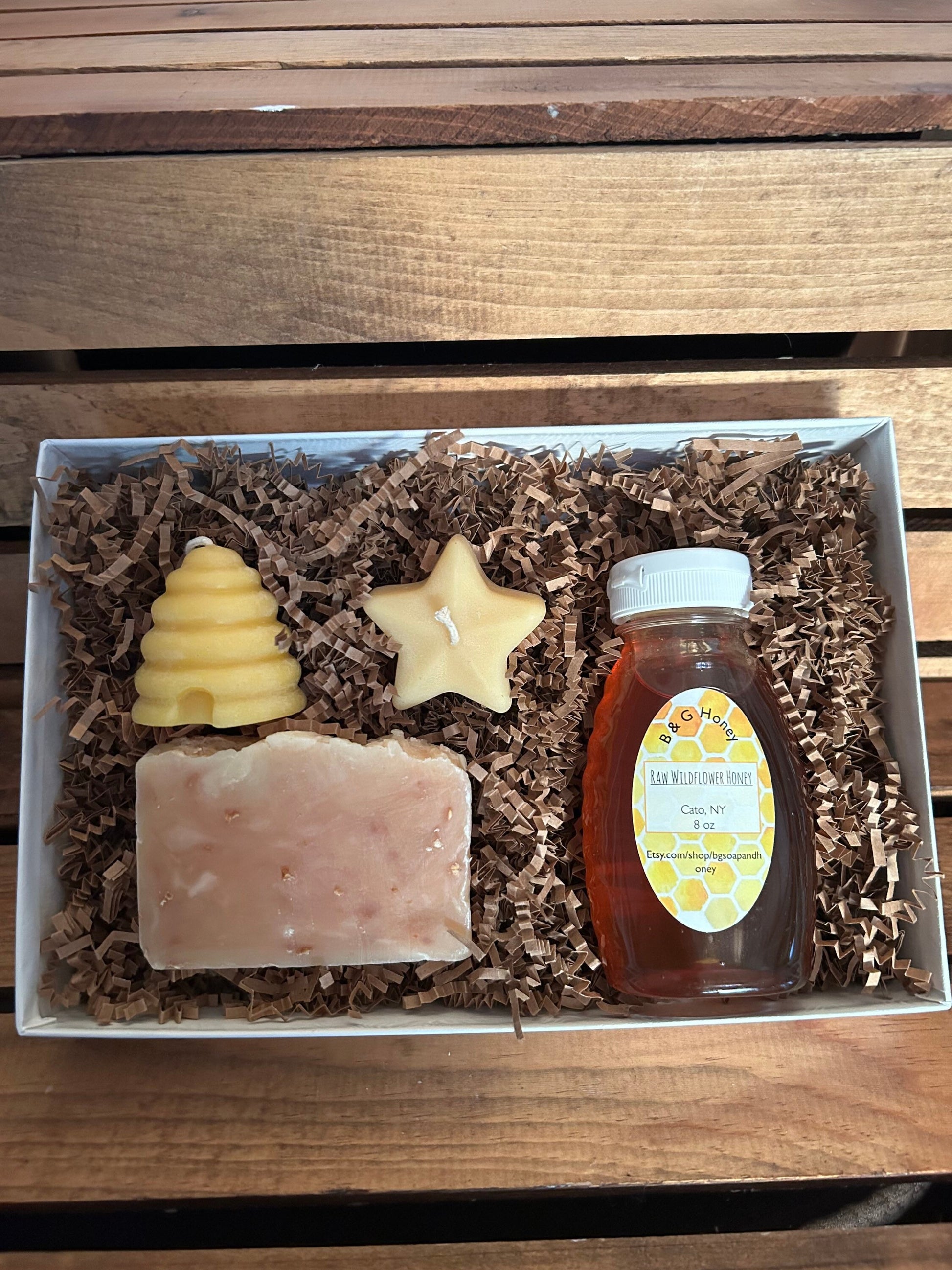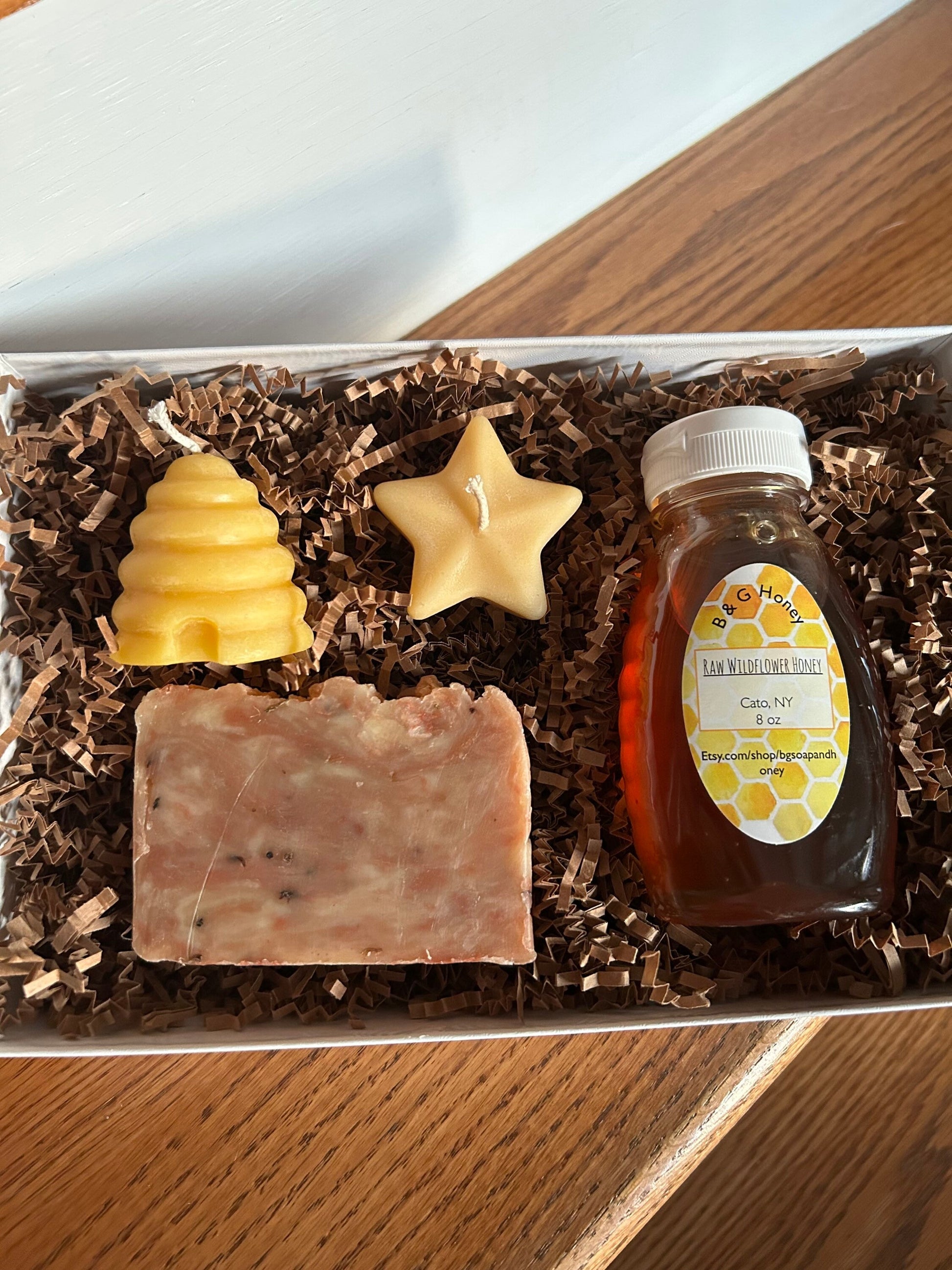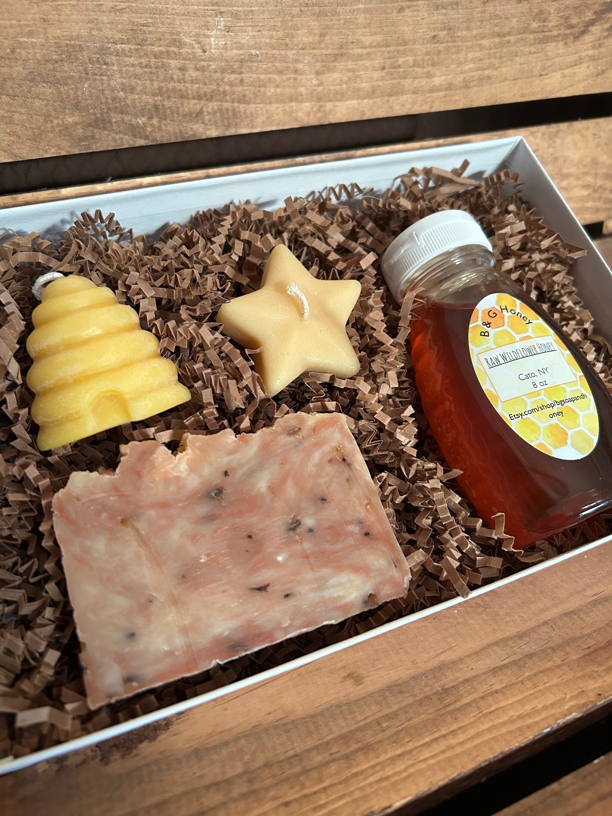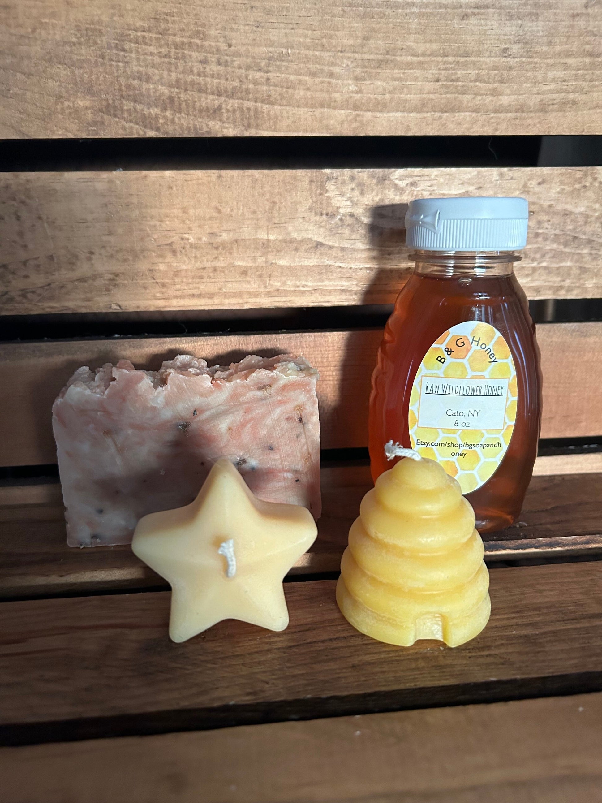 Here’s a gift that everyone will love! You can choose either Lemon Exfoliating or Lavender Soap both a 4oz hand cut bar, 8oz bottle of raw wildflower honey and two beeswax candles. One is in the shape of a beehive and the other is in the shape of a star