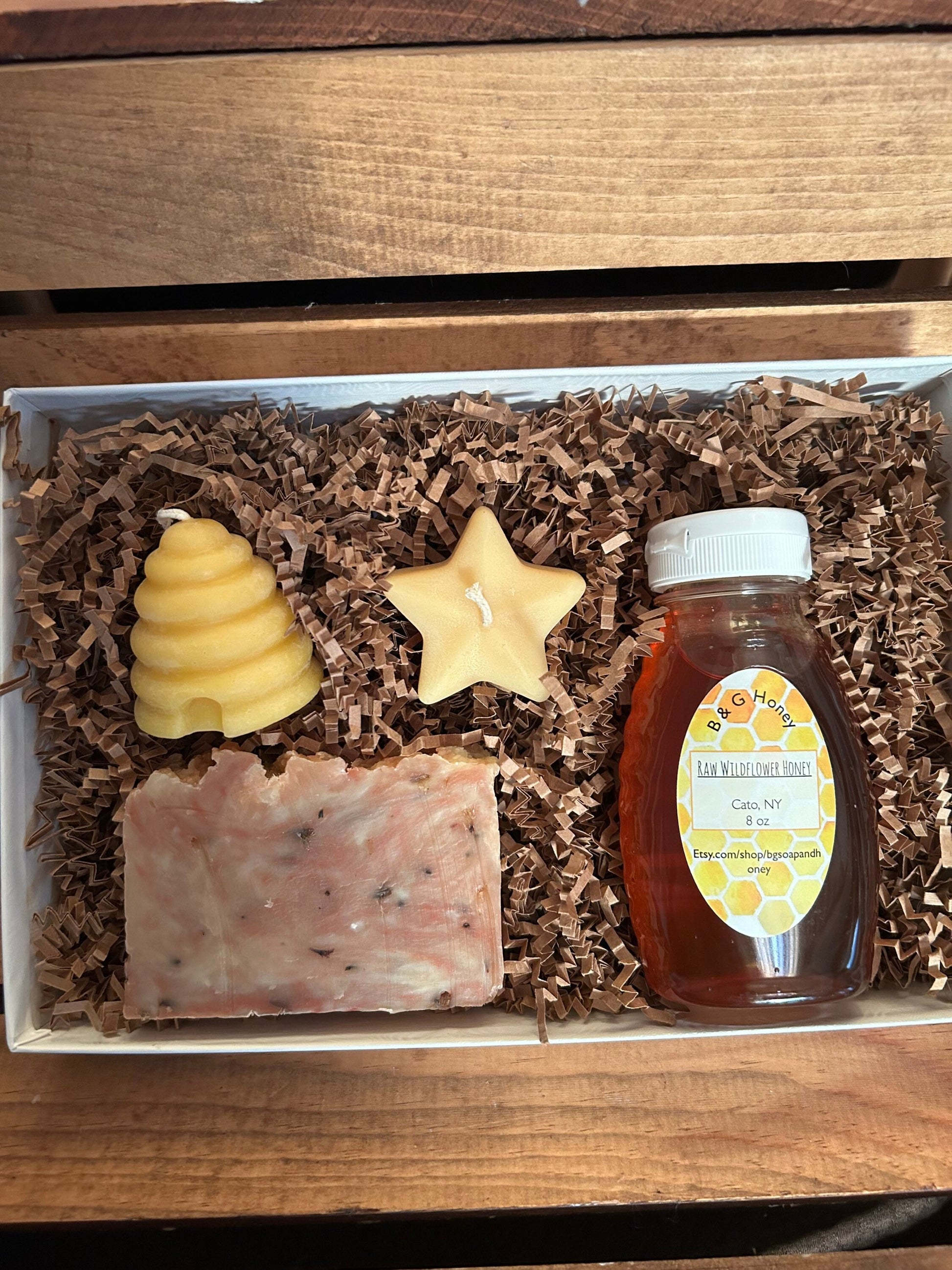 Materials: beeswax candles,wildflower honey,lemon soap,lavender soap