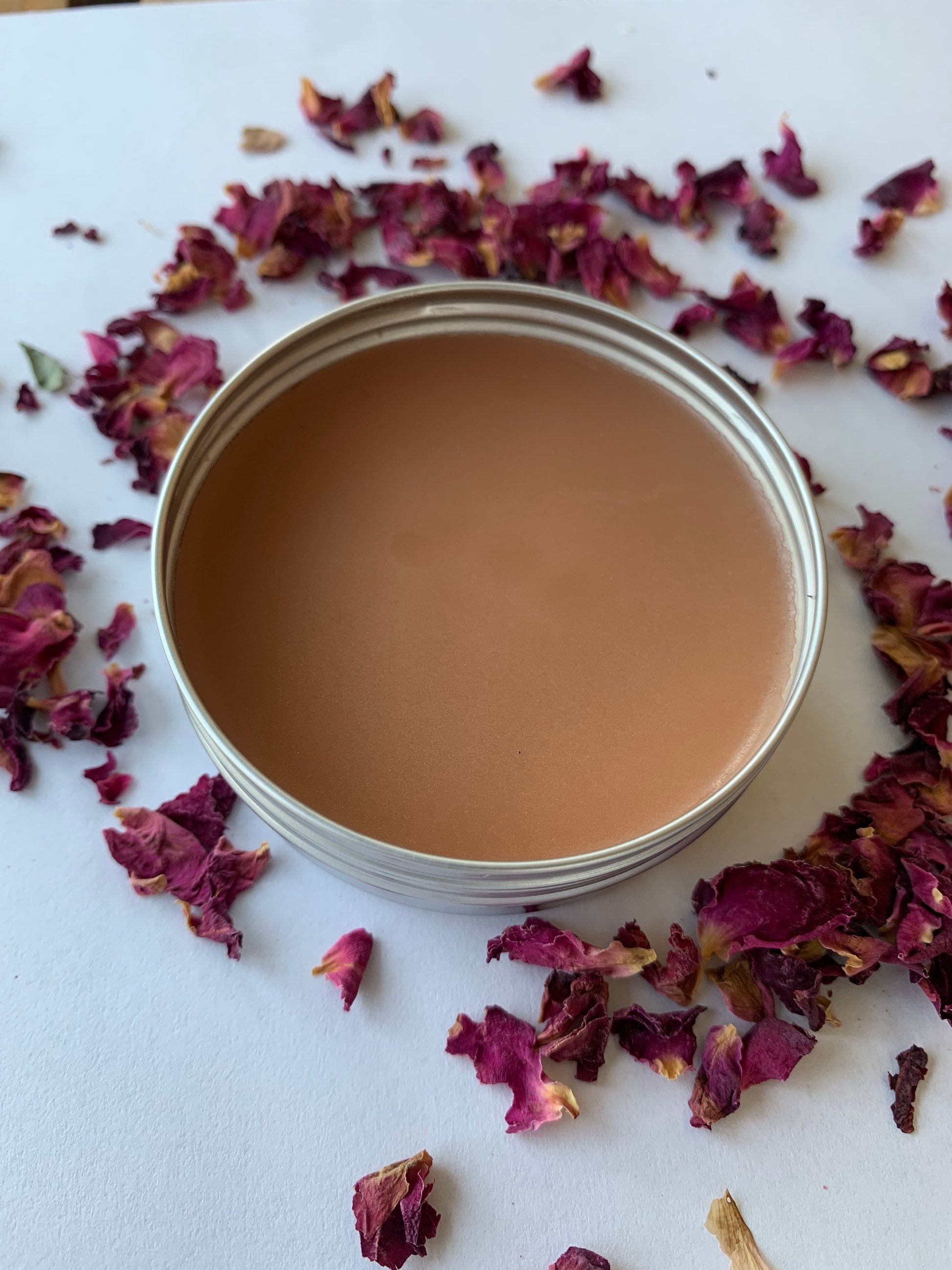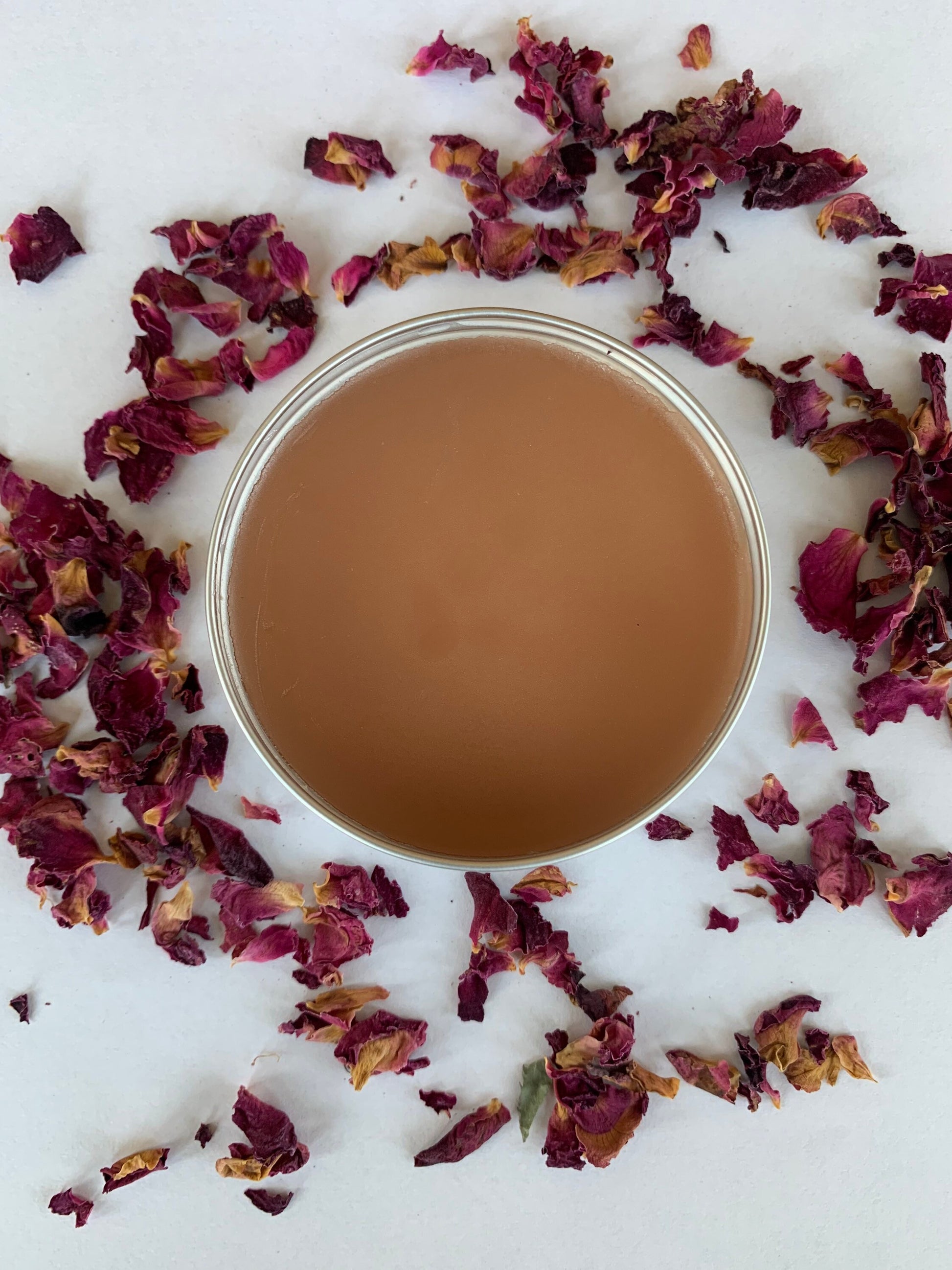 Materials: beeswax,rose clay,organic dried roses,almond oil,alkinet root powder