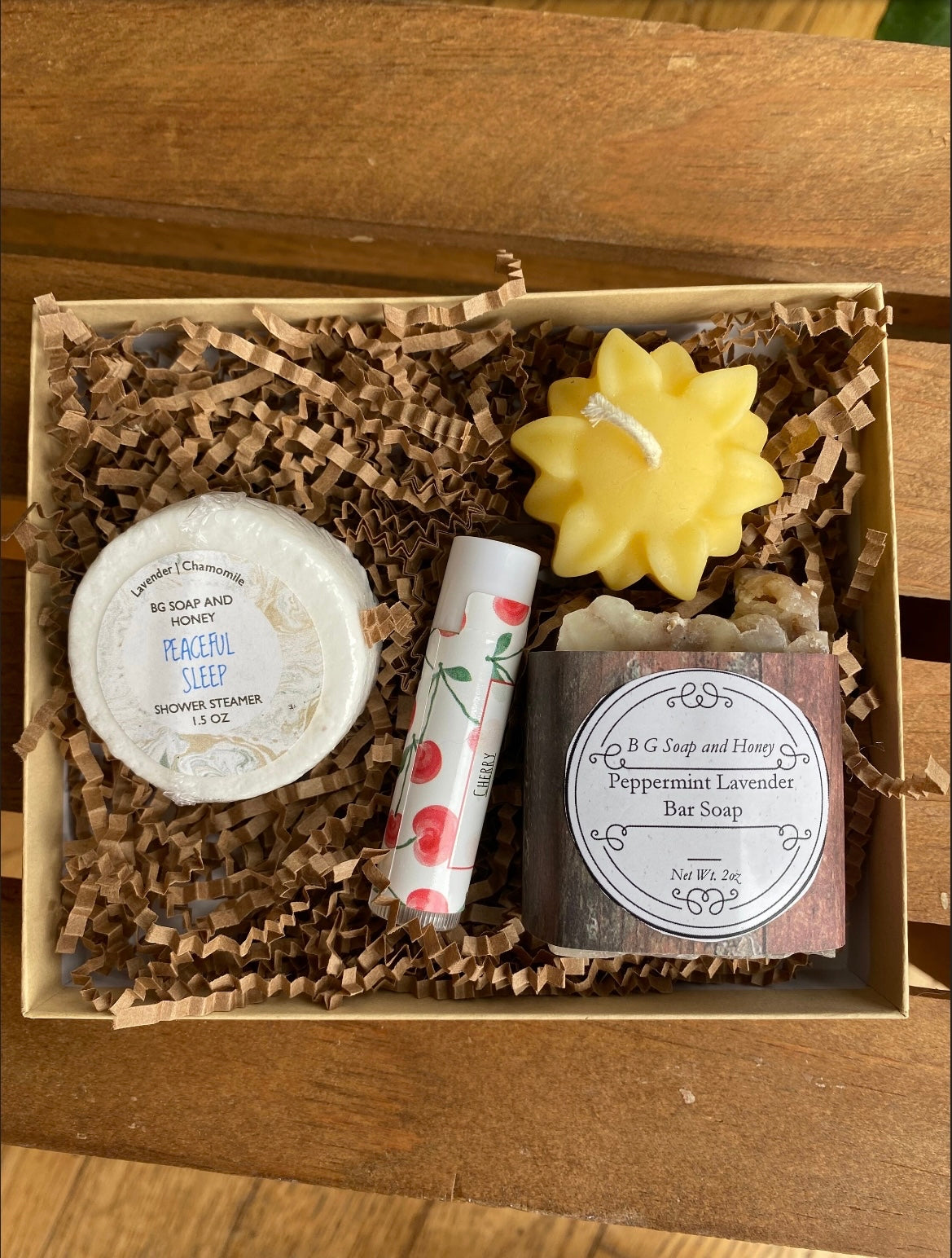 Shower Steamer, Peppermint Lavender Soap, Lip Balm, Flower Candle- Gift Box