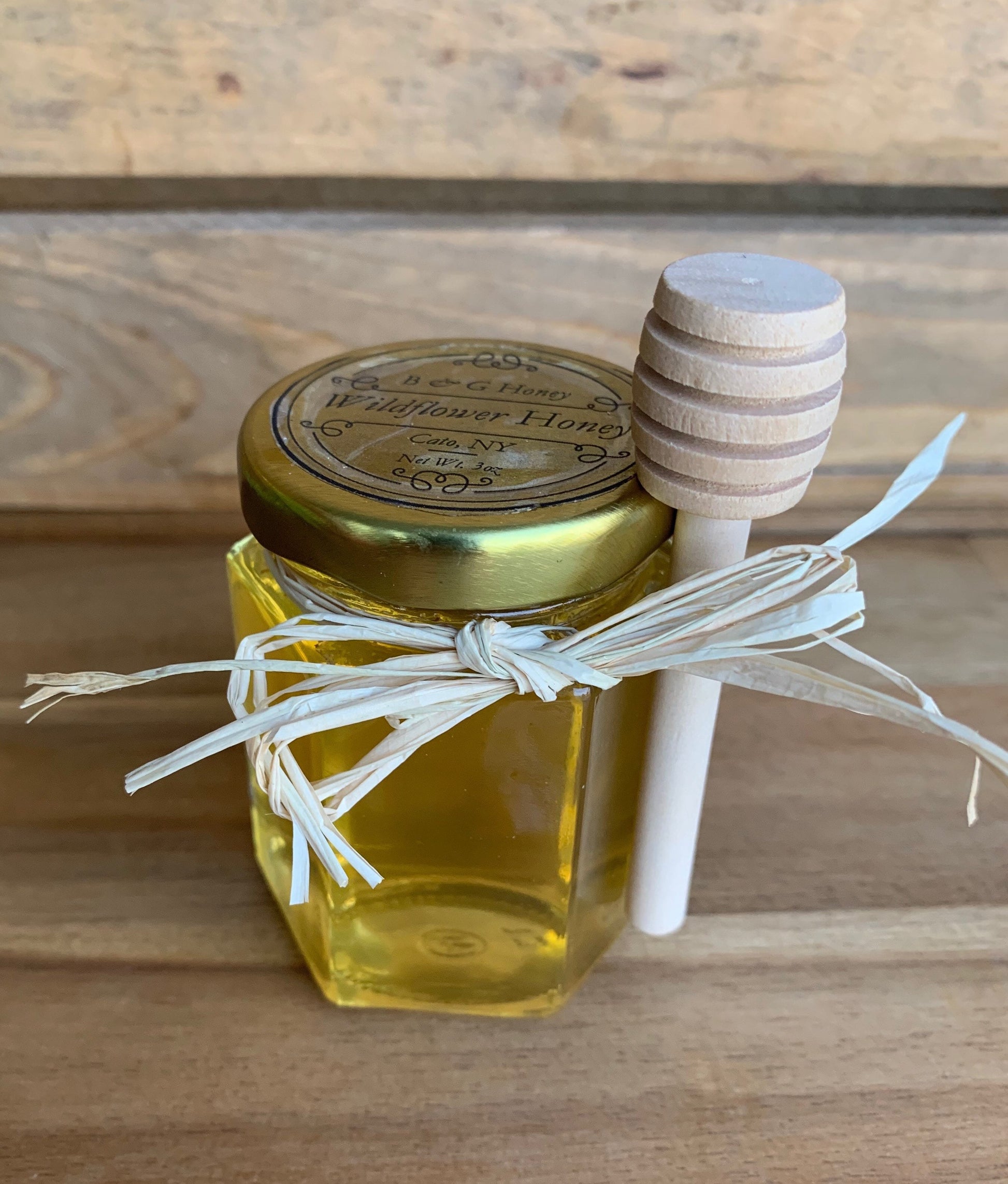 Raw wildflower honey in a hexagon glass jar 3.5oz and a mini honey dipper measures 3” tall. Our honey is raw, never pasteurized, and slightly filtered, so it retains all the vitamins, minerals, enzymes and antibacterial properties that raw honey is known for.